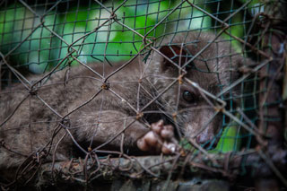捕らえられたジャコウネコは、狭い金網の中で過ごすことを強要され、コーヒーの実だけをたらふく食べさせられます。
